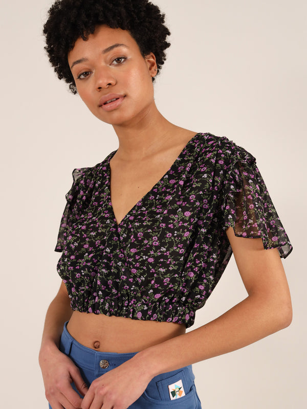 Wildflower Surplice Crop Top, Upcycled Polyester, in Black Flower Print